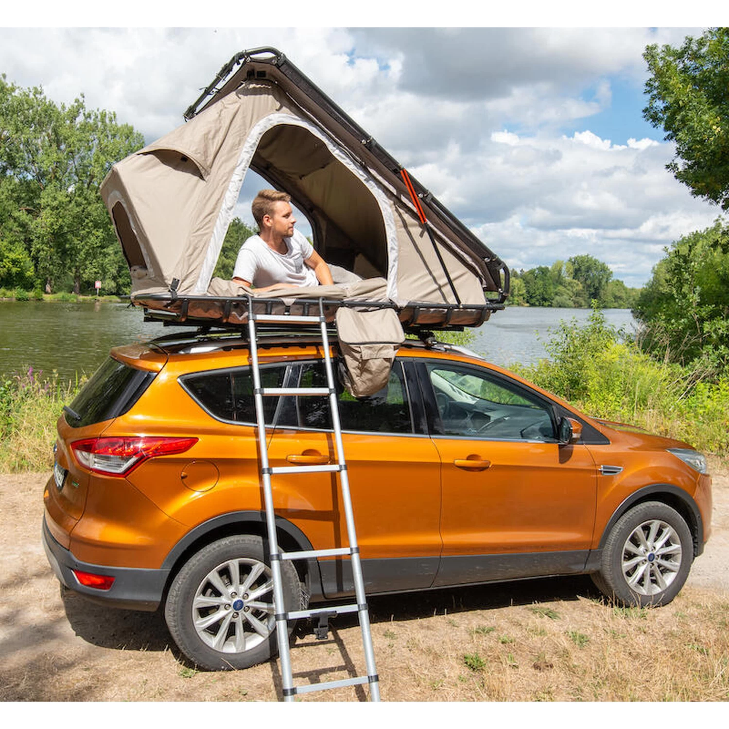 Tente de toit légère à fixer sur presque tous les modèles de véhicules courants (env. 38 kg), échelle télescopique en aluminium incluse, matelas gonflable inclus, fenêtres en TPU, ciel étoilé.